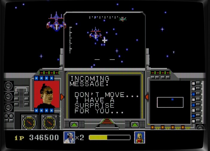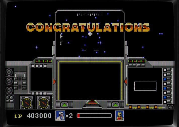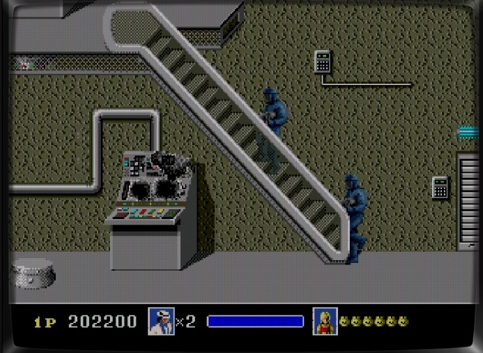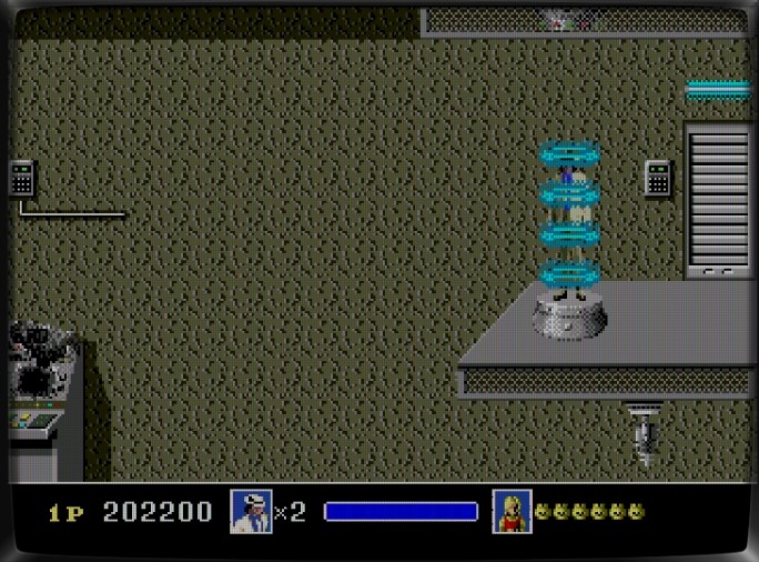 Boss: Another giant machine, plus enemy soldiers. Hold your ground and keep firing. Then suddenly… a spaceship appears out of nowhere. By now, your D-pad reflexes should be godlike — use them to survive.