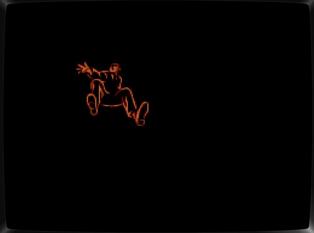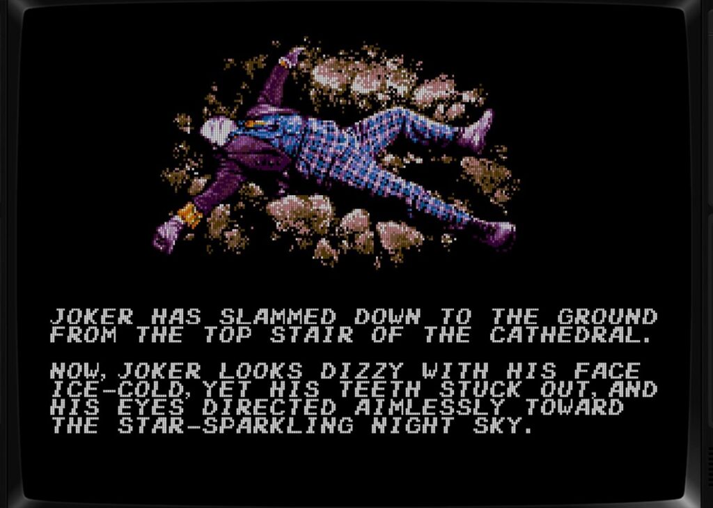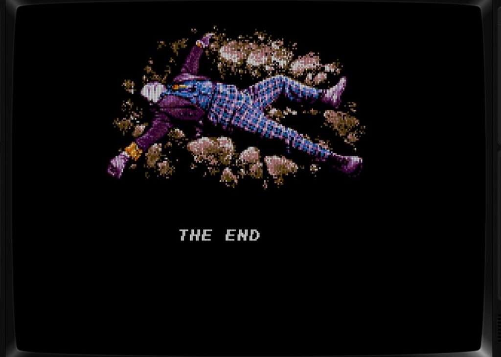 The villain tumbles out of the building and meets his end. Even though the background is just black pixels, you can feel the justice being served.