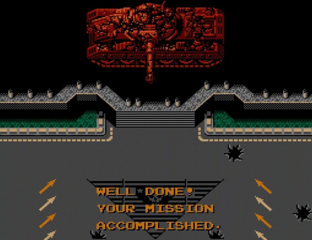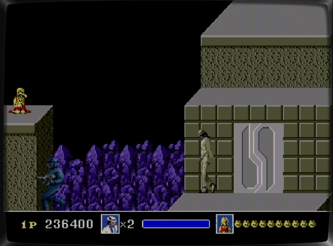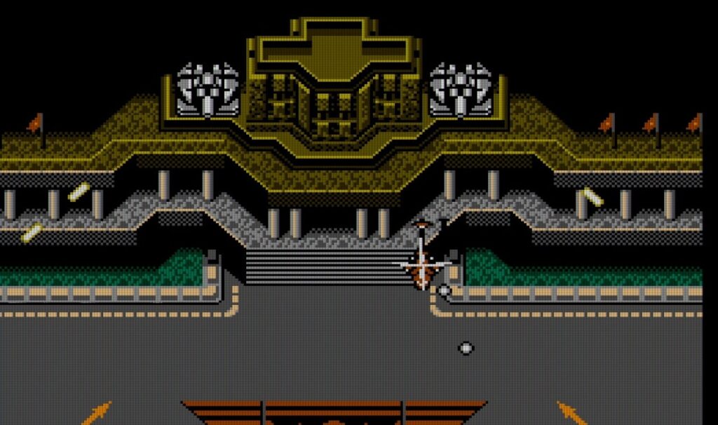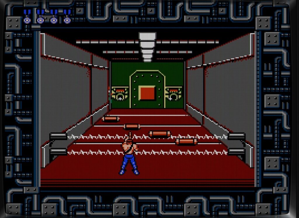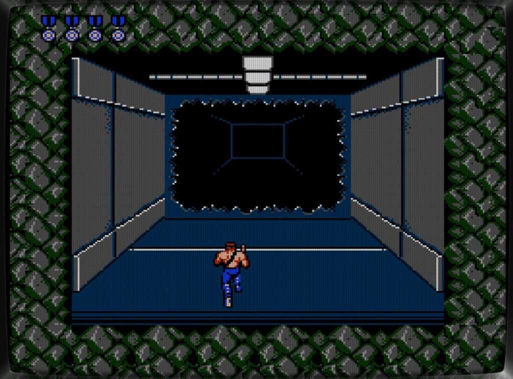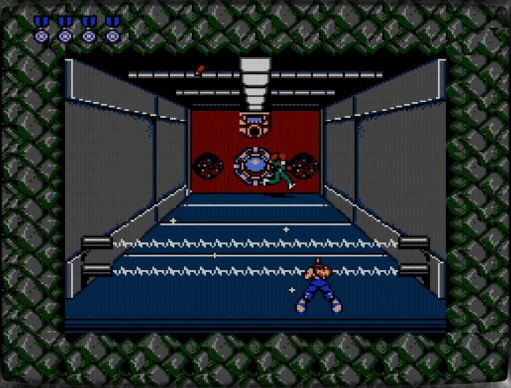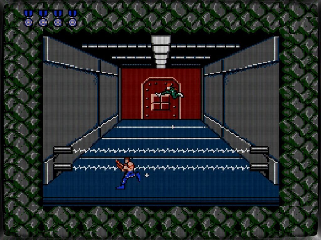 After destroying the entrance, you infiltrate the enemy base. This stage blew our minds back in the day — a 3D-style base run in an 8-bit game!
