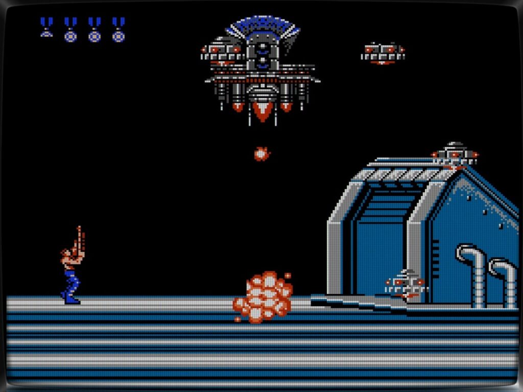 Boss: An alien UFO! The Contra universe just keeps expanding. Shoot both the ship and its projectiles. When it disappears and reappears, bombard it with bullets again.