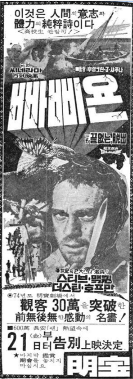 이 영화는 한국에서 1974년 2월 국제·명보극장에서 최초 개봉된 이후, 3년 뒤인 1976년 가을에 재상영 (“가을 명화 특별 감상회”) 형식으로 다시 걸렸다.